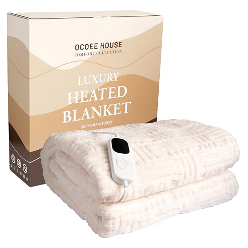 Ocoee House Luxury Heated Blanket, Electric Throw - 180x160cm King Size Ecru Thick Heavyweight Patterned Sherpa Fleece. 6 Heat Settings, Digital controller. ETL/VDE certified