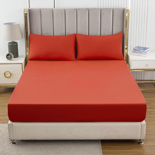 Soifox King Size Fitted Sheet Burnt Orange - Bed Sheets with Extra Deep Pocket 16 inch (40 cm), Soft Microfiber Bottom Sheet for Kingsize Bed, 150x200cm