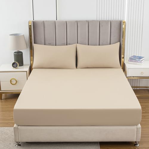 Soifox King Size Fitted Sheet Sandy Beige - Bed Sheets with Extra Deep Pocket 16 inch (40 cm), Soft Microfiber Bottom Sheet for Kingsize Bed, 150x200cm