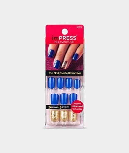 KISS IMPRESS PRESS ON NAILS ONE STEP MANICURE FLASH MOB BLUE GOLD GLITTER ACCENT