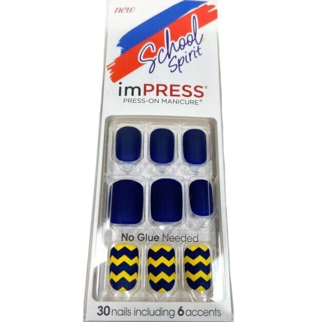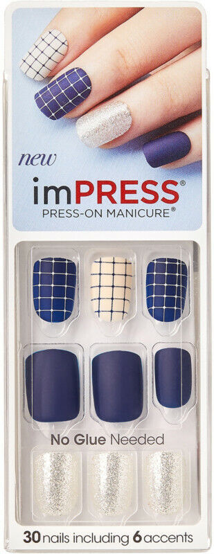 KISS IMPRESS PRESS ON NAILS ONE STEP MANICURE CAMPUS ROYAL BLUE CHEVRON ACCENTS
