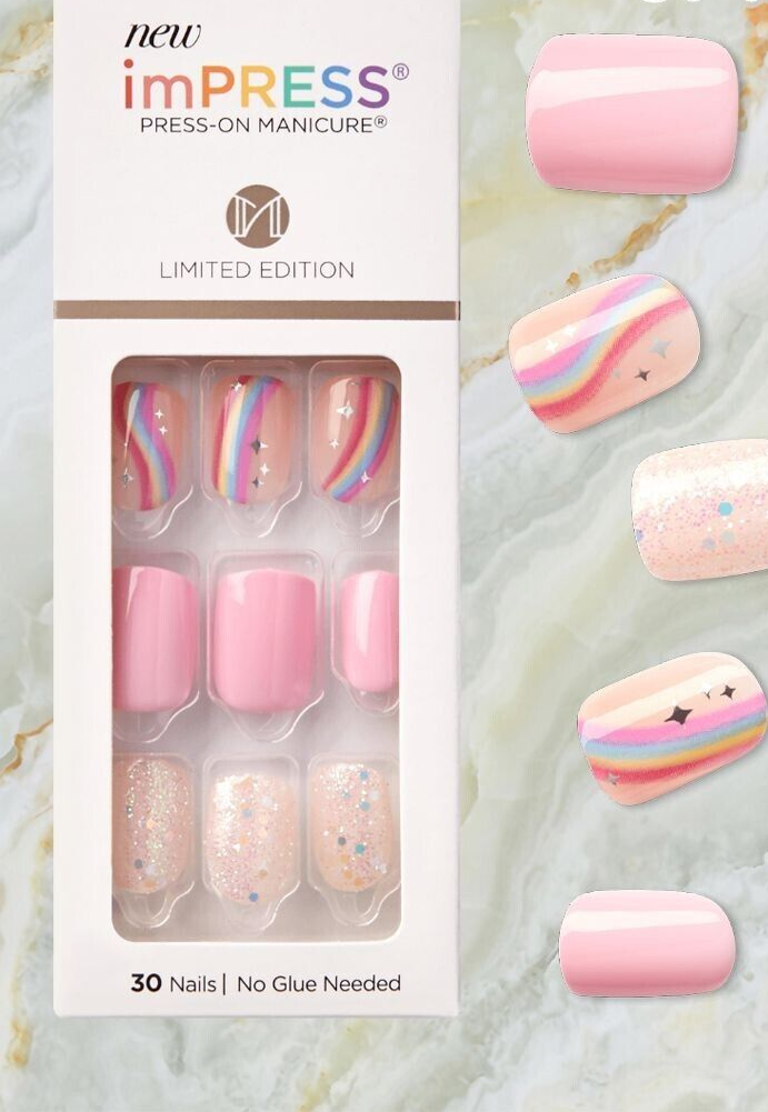 KISS IMPRESS PRESS ON NAILS ONE STEP MANICURE SPRING BLOOM PINK RAINBOW GLITTER