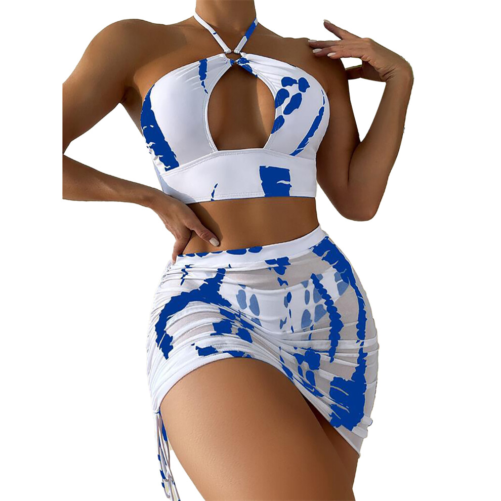 Wsdsgz Women Tie Dye Print Swimsuit 3 Pcs Split Bathing Suit with Long Skirt Fashion Swimwear Swimming Costume Set Women Tie Dye Print Swimsuits Halters Bathing Suit