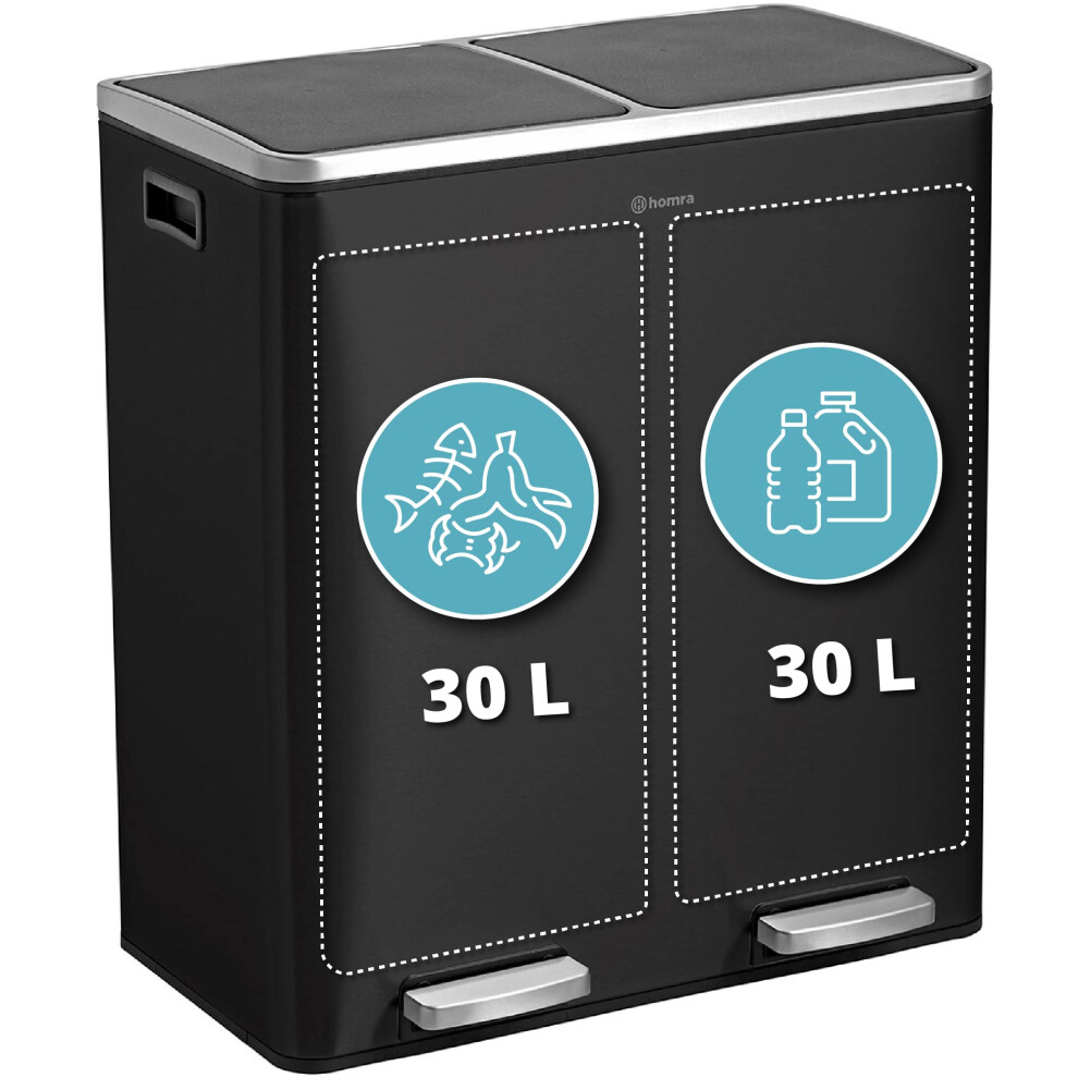 Homra Dual Kitchen Bin 60l – Double Rubbish Bins 2x30l – 2 Compartment Pedal System – Twin Section Waste&Recycling Separation – Soft Close Design – Inner Buckets with Handles - Stainless Steel