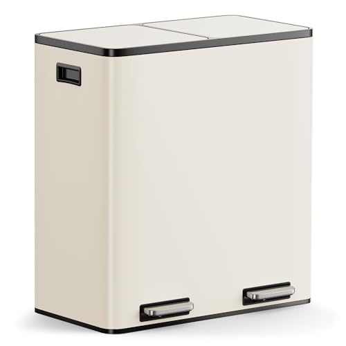 VonHaus Kitchen Bin, 60L Double Recycling Bin for Kitchen, Two Section Food Waste Separation System with Non-Slip Base & Removable Inner-Compartments, Large Airtight Trash Can, 2 x 30L (Cream)