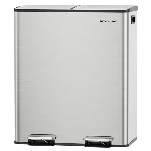 Lovewind Kitchen Bin, 2 * 30L Bins for Kitchen, Double Bin Recycling and Waste, Silver, Stainless Steel Garbage Can with Lid and Inner Buckets, Large Capacity, Soft-Close Lid