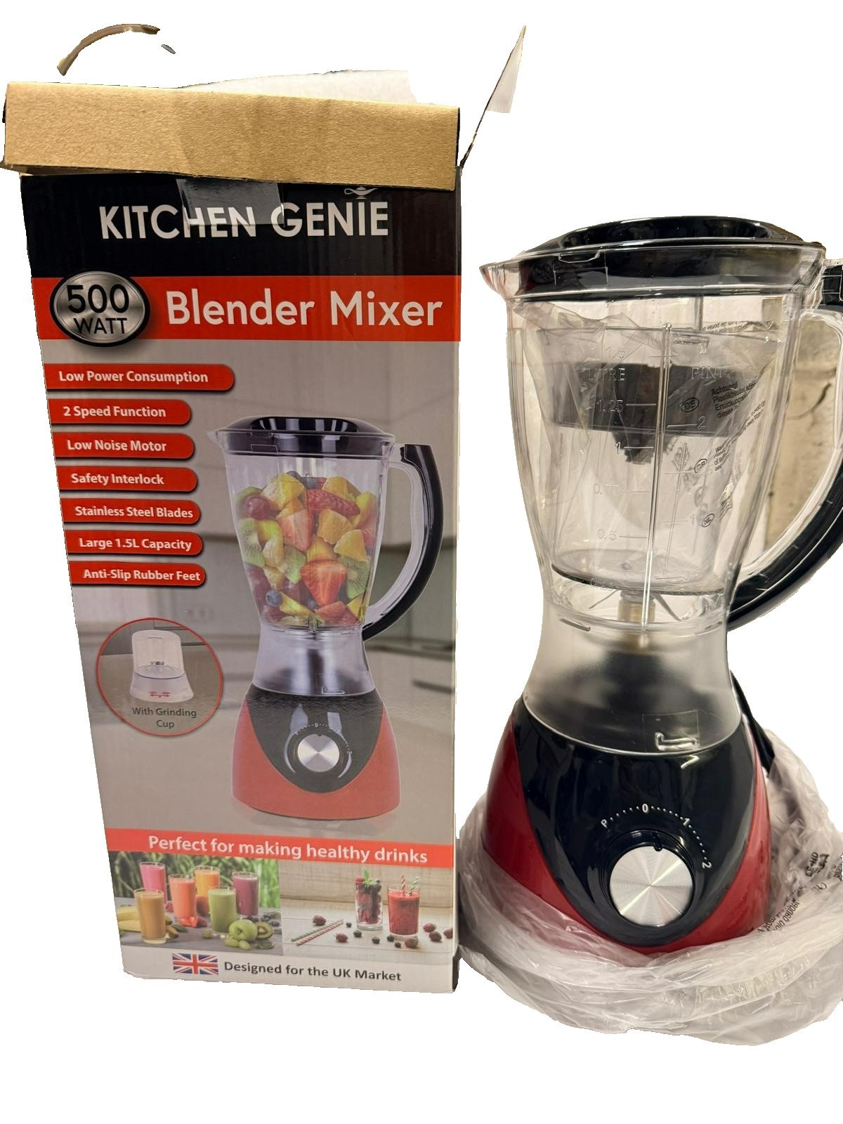 Kitchen Genie Blender Mixer 500W 1.5L With Grinder Smoothie Maker Black/Red