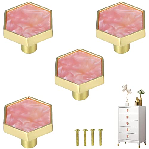 Brosay Pink Drawer Knobs Hexagon Cabinet Pulls for Furniture Wardrobe Cupboard Marble Kitchen Cabinet Door Handles 4 Pcs (Pink)
