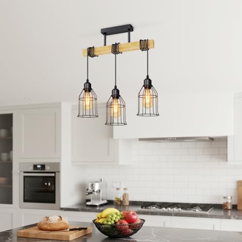 LVWIT Black Kitchen Lights Ceiling,Pendant Lighting,Vintage Hanging Lights,Wood Ceiling Light Fitting,3 Way Drop Light Ceiling,Industrial Ceiling Light for Lving and Dining Room(E27 Base,NO Bulbs)