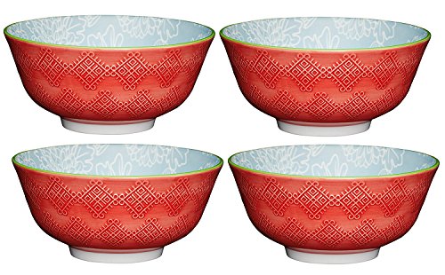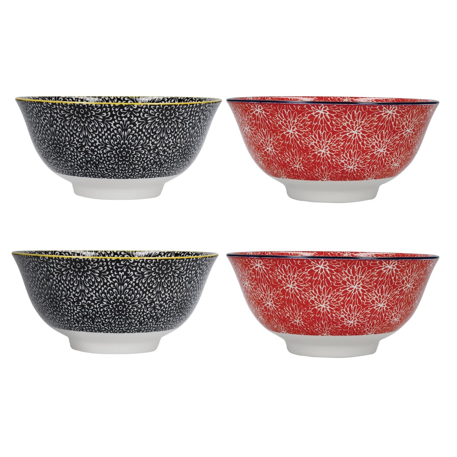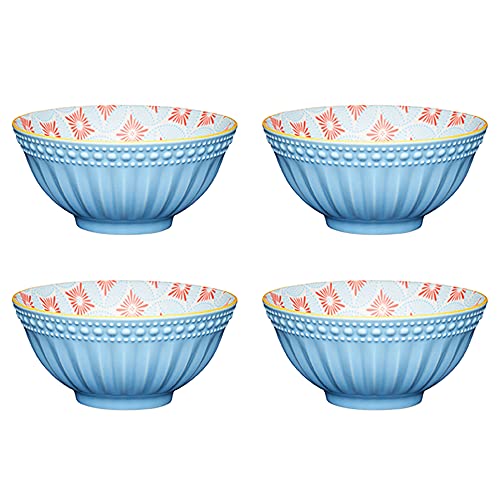 KitchenCraft Set of 4 Glazed Stoneware Bowls with Tile Flower Pattern, Red & Blue Ceramic Bowls with Footed Base, Microwave & Dishwasher Safe, 15.7 cm (6")