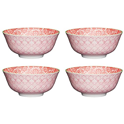 KitchenCraft Footed Vintage-Style Floral-Patterned Ceramic Bowls, 15.5 cm (6") - Red / Pink (Set of 4)