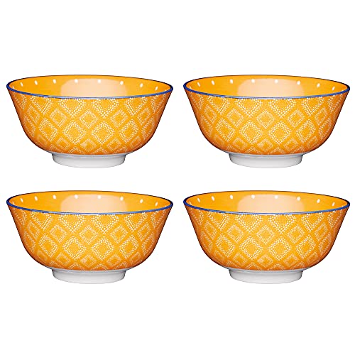 KitchenCraft Set of 4 Glazed Stoneware Bowls with Spotty/Textile Pattern, Bright Orange Ceramic Bowls with Footed Base, Microwave & Dishwasher Safe, 15.7 cm (6")