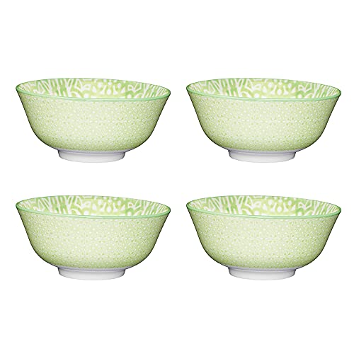 KitchenCraft Set of 4 Glazed Stoneware Bowls with Tile Pattern, Green Ceramic Bowls with Footed Base, Microwave & Dishwasher Safe, 15.7 cm (6")