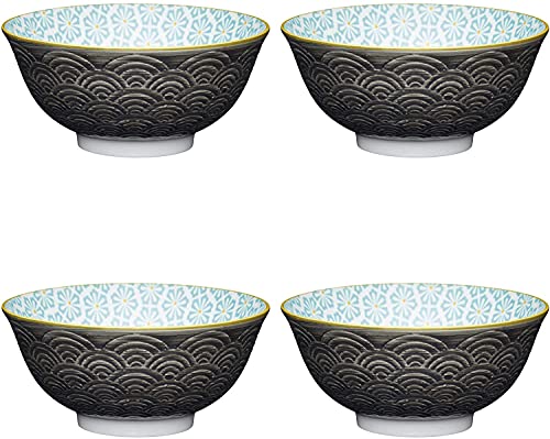 KitchenCraft Set of 4 Glazed Stoneware Bowls with Japanese Wave & Floral Pattern, Grey & Turquoise Ceramic Bowls with Footed Base, Microwave & Dishwasher Safe, 15.7 cm (6")