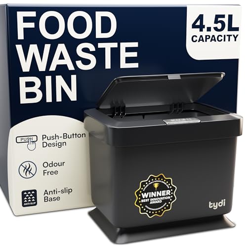 Tydi 4.5L Food Waste Bin with Press-Button Lid – Compost Bins for Kitchen - Anti-Slip Base and Secure Lid Kitchen Compost – Small Indoor Caddy for Cupboard or Countertop – Black