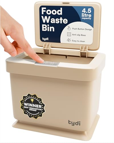 Tydi 4.5L Food Waste Bin with Press-Button Lid – Compost Bins for Kitchen - Anti-Slip Base and Secure Lid Kitchen Compost – Small Indoor Caddy for Cupboard or Countertop – Taupe