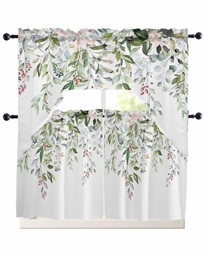 Spring Floral Swag Curtains Valance and Tier Set, Flowers Eucalyptus Leaves Rod Pocket Curtain Drapes for Bedroom Bathroom Over Sink Kitchen Curtains 3 Piece Set Swag Valances and 24 inches Tiers