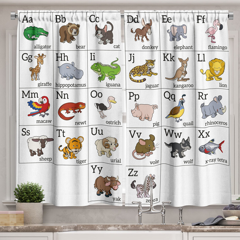 Ambesonne ABC Kitchen Curtains Cartoon Animals Design with Names Letters Unitials Upper and Lowercase Art Print Window Drapes 2 Panel Set for Kitche