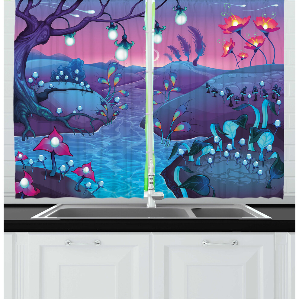 Ambesonne Mushroom Kitchen Curtains Cartoon Style Fantasy Nocturnal Landscape with The River Mushrooms and Trees Window Drapes 2 Panel Set for Kitch