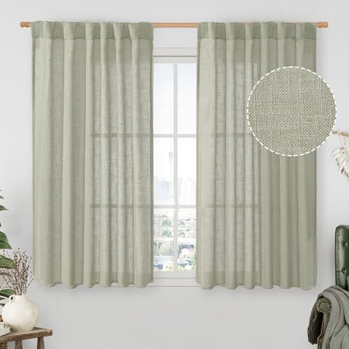LAMIT Small Window Linen Curtains for Kitchen, Cafe Curtains 24 inch Semi Sheer Light Filtering Panels Back Tab and Rod Pocket Drapes for Small Window, 2 Panels, Sage Green, 34 x 24 Inch