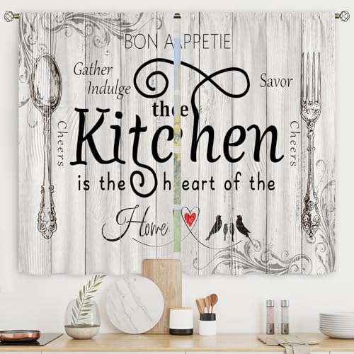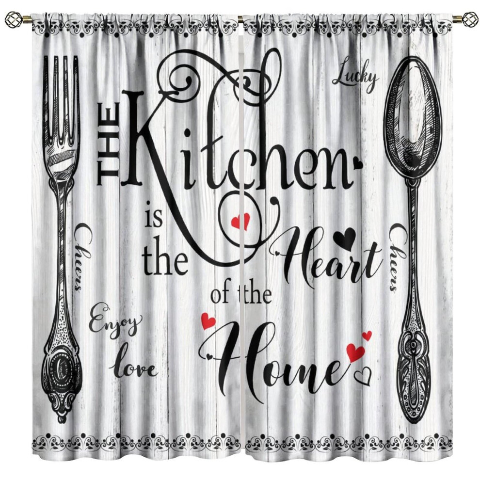 Riyidecor Farmhouse Kitchen Curtains 55x39 Inch Rod Pocket Rustic Country Short Small Fork and Spoon Wooden Board Retro Vintage Wood Printed Living Room Bedroom Window Drapes Treatment Fabric 2 Panels