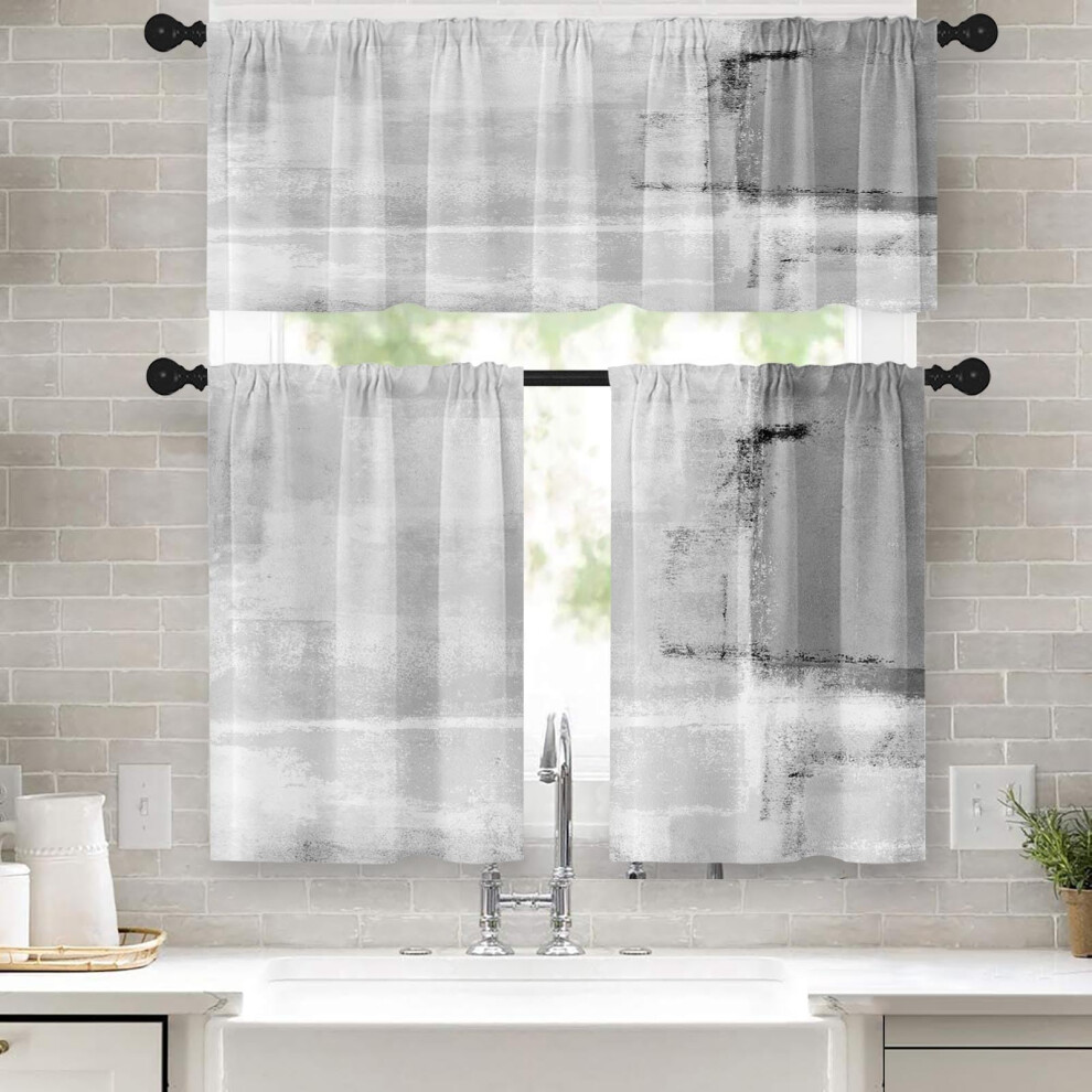 Abstract Grey Kitchen Window Curtains Valance and Tier Set 52x36 Inch Modern Rod Pocket Cafe Drapes