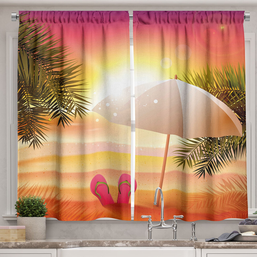 Ambesonne Orange Kitchen Curtains Sunset at The Beach with Flip Flops Umbrella and Palm Trees Illustration Window Drapes 2 Panel Set for Kitchen Caf