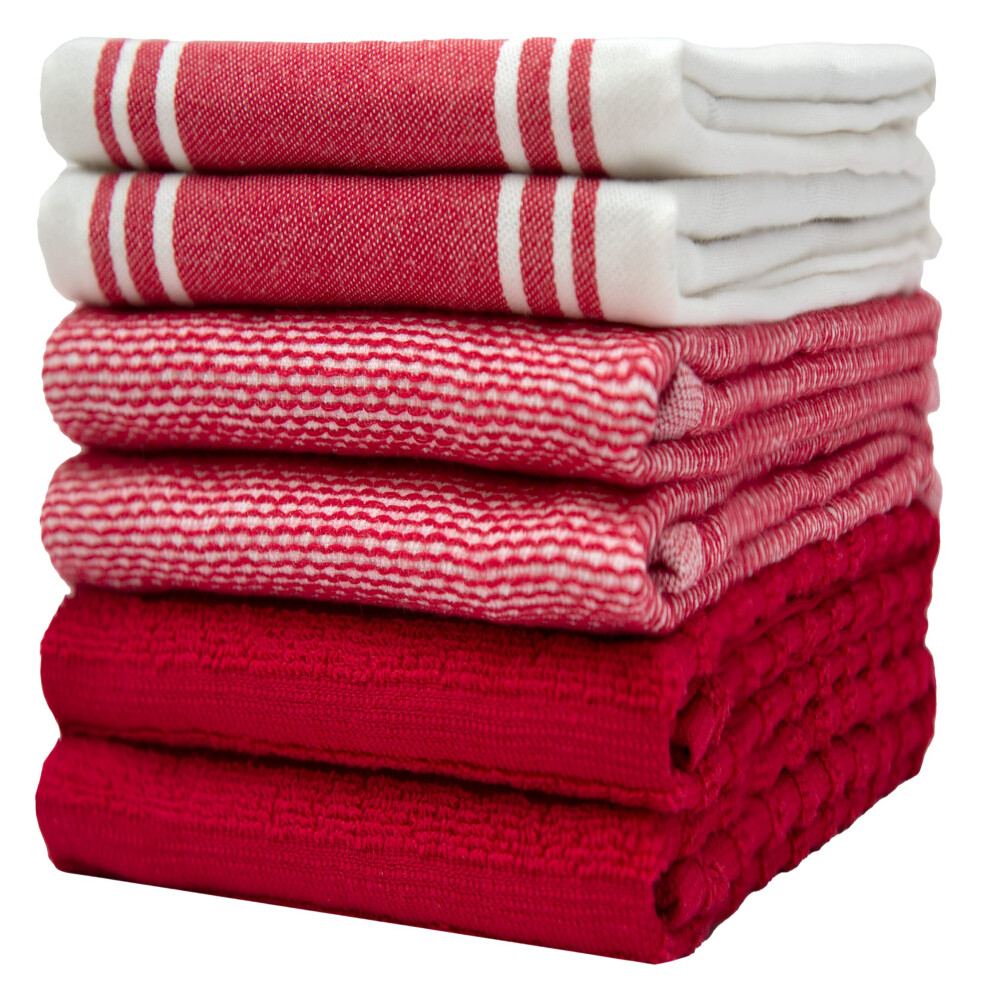 6 Pack Large Tea Towel Set | Absorbent Kitchen Hand Towels | Soft Cotton Dish Towels | Horizontal Ribbed Flat & Terry Towel with Hanging Loop | Vibrant Dyed - Red (50 x 70cm)