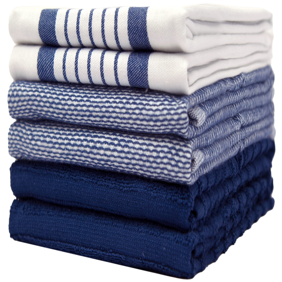 6 Pack Large Tea Towel Set | Absorbent Kitchen Hand Towels | Soft Cotton Dish Towels | Horizontal Ribbed Flat & Terry Towel with Hanging Loop |