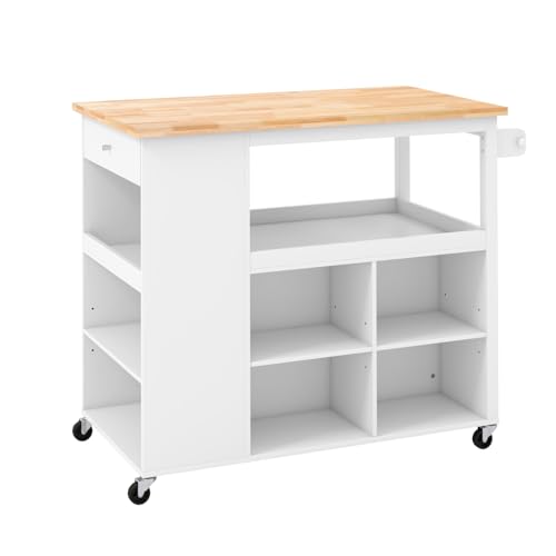 GiantexUK Kitchen Island Cart on Wheels, Mobile Storage Cabinet Cart with Rubber Wood Countertop, Drawer, Spice Racks & Towel Rack, Utility Serving Trolley for Home Dining Living Room (White Body)