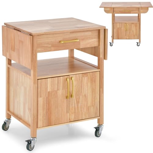 COSTWAY Drop Leaf Kitchen Storage Trolley, Kitchen Island on Wheels with 2-Door Cabinet, Drawer and Open Shelf, Rolling Serving Storage Cart for Living Dining Room