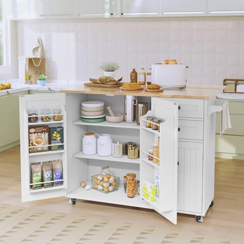 Jaxenor Rolling Kitchen Island on Wheels with Large Cabinet, Kitchen Trolley with Folding Side Board, Spice Rack, Adjustable Shelf, Storage Trolley with 3 Drawers for Home Kitchens, White