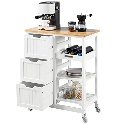 SoBuy Kitchen Island on Wheels, Free Standing Kitchen Trolley Storage Unit with 3 Drawers and Removable Tray, Butchers Block Trolley, White, W67xD37xH84cm, FKW79-W