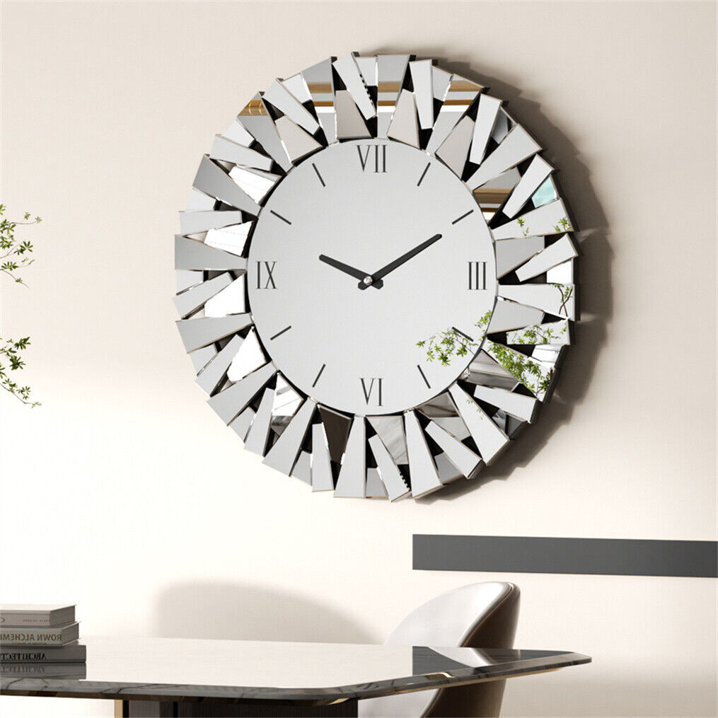 Silver Decorative Wall Clocks Large Kitchen Clocks 3D Sun-Bursting Beveled Frame