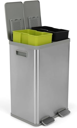 Simpli-Magic 60 Liter / 16 Gallon Rectangular Hands-Free Dual Compartment Recycling Kitchen Step Trash Can with Soft-Close Lid, Brushed Stainless Steel (30L x 30L Capacity)