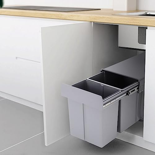 ybaymy Pull Out Kitchen Waste Bin Under Cabinet 20L + 20L Recycling Kitchen Cabinet Trash Can with Lid and Handle Waste Containers with Double Sliding Trash Can Rubbish Garbage Sorting Gray