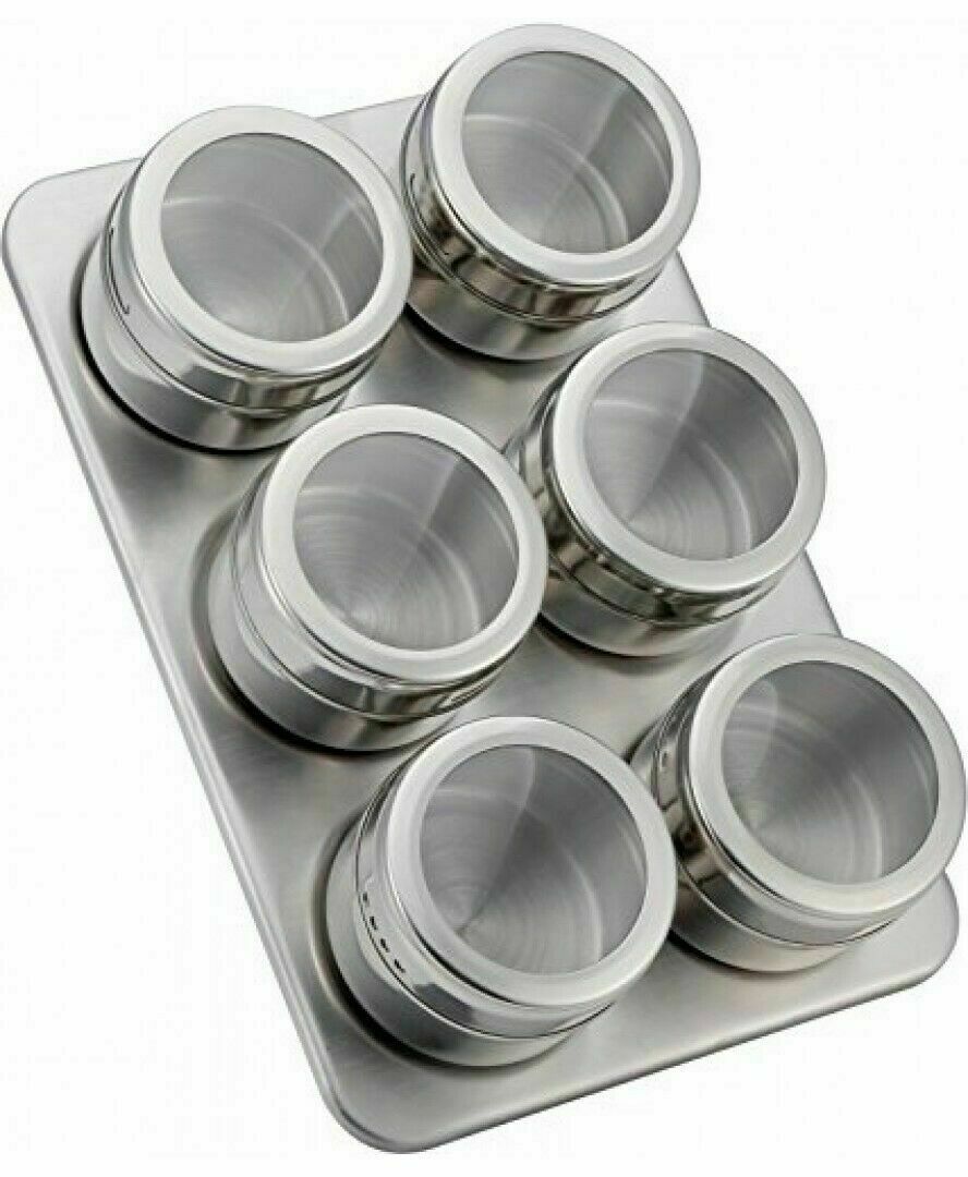 6 Pc's Magnetic Herb Spice Kitchen Rack Tin Jar + Holder Stand Stainless Steel
