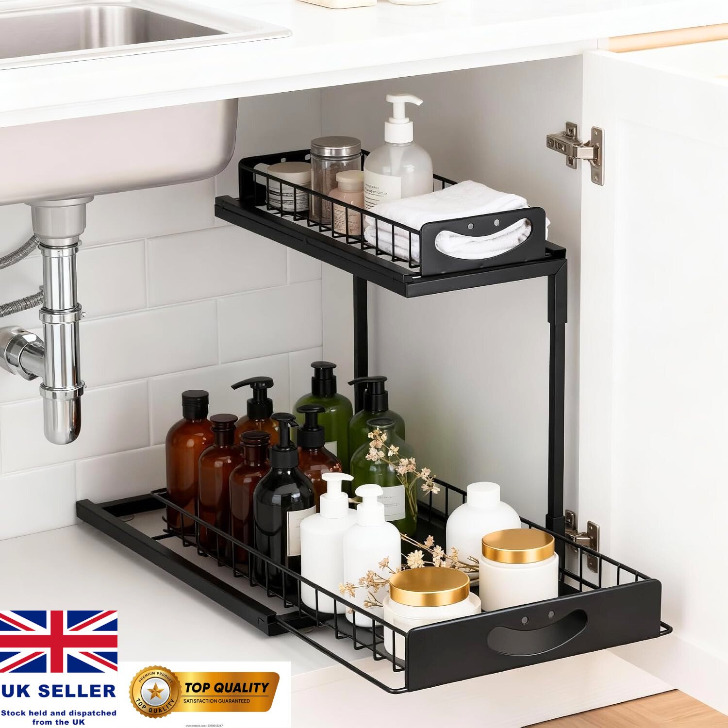 2-Tier Pull Out Under Sink Kitchen Organizer Rack, UK Cupboard Storage Solution