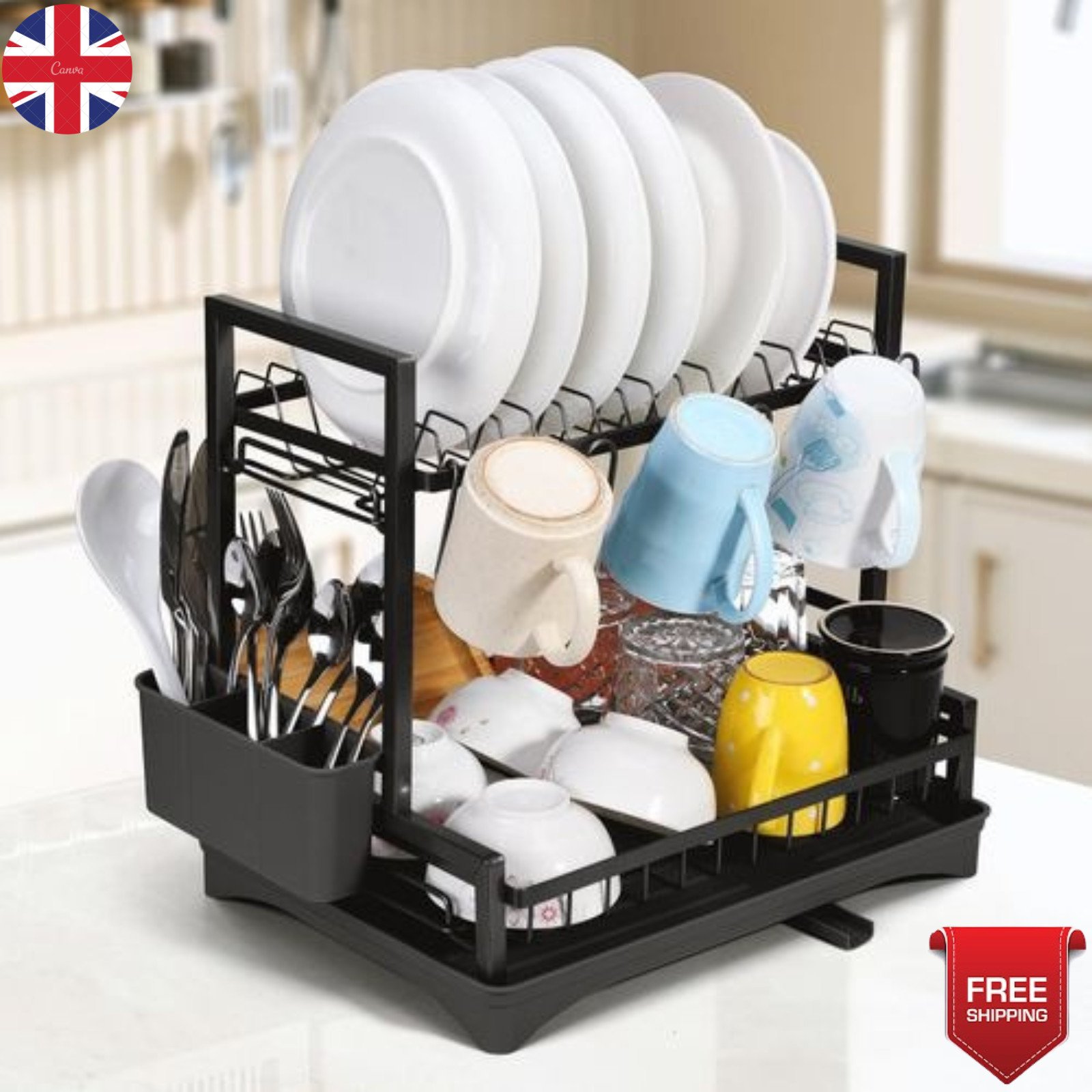 2 Tier Dish Drainer Rack With Drip Tray Kitchen Drying Rack Bowl Plate Holder UK