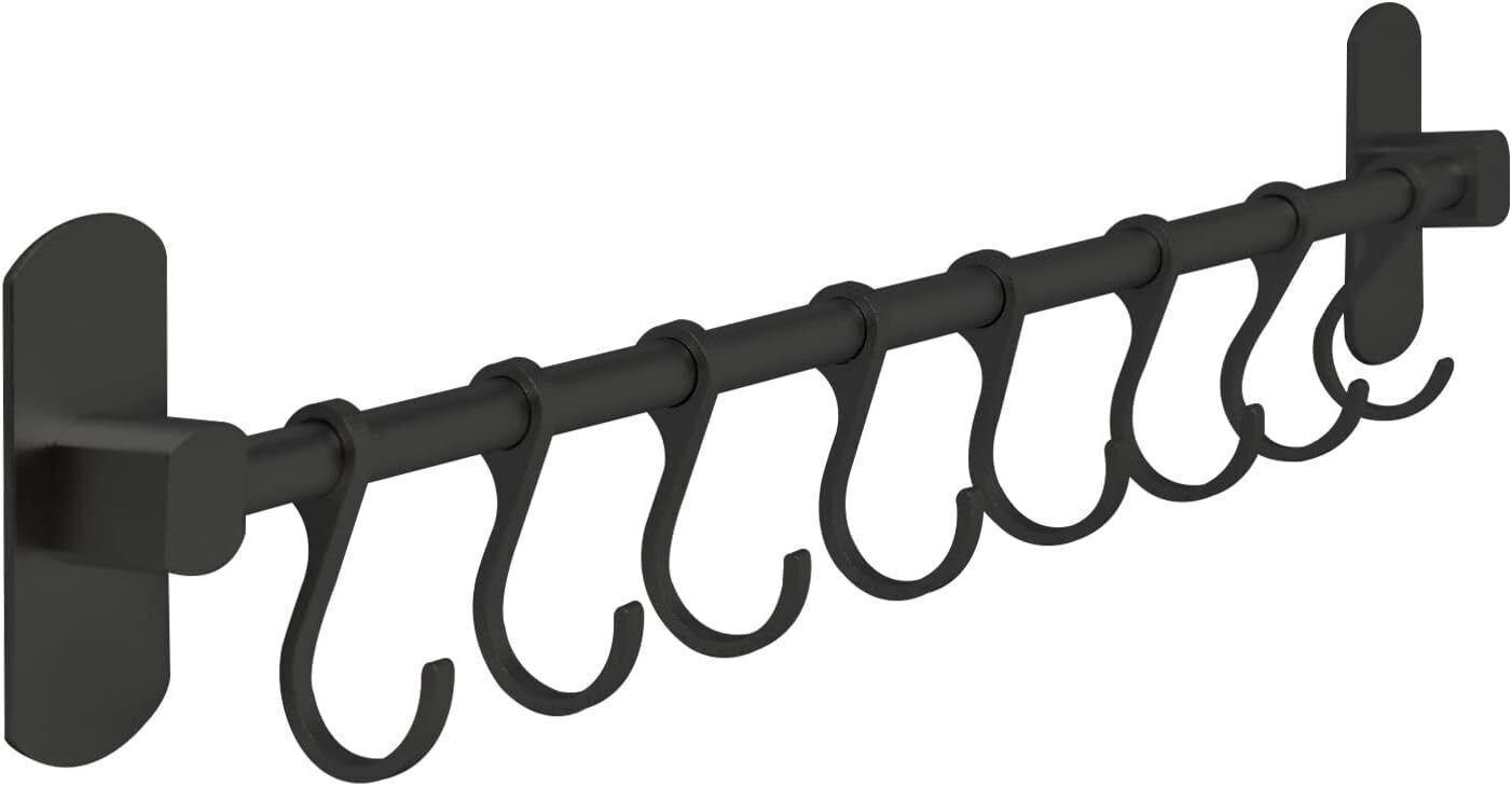 joeji's Kitchen Utensil Rack 40cm - Aluminium Kitchen Rail with 8 Hanging Hooks - Wall Mount Strong 3M Self Adhesive - No Drill Space-Saving Tool Holder - Black