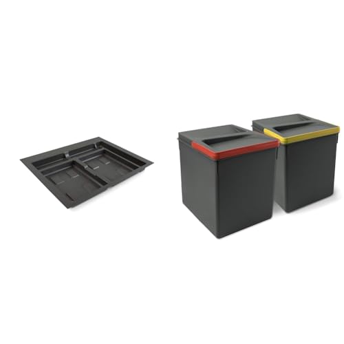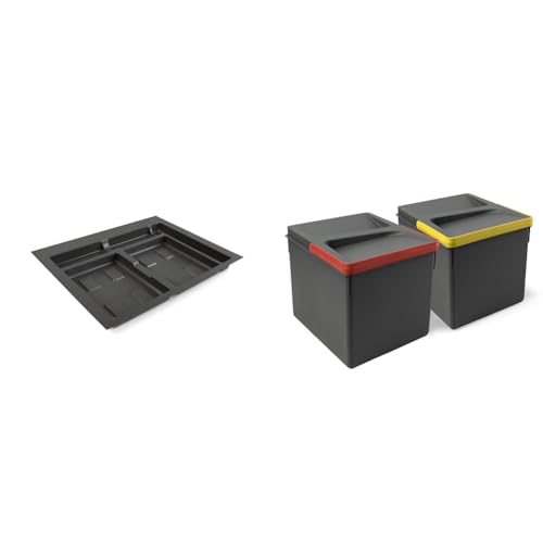 Emuca - Containers + base for Recycle kitchen drawer, 2 H216mm bins (2x12L), 1 cuttable base for recycling bins for 60cm module (536x482mm), Anthracite grey plastic