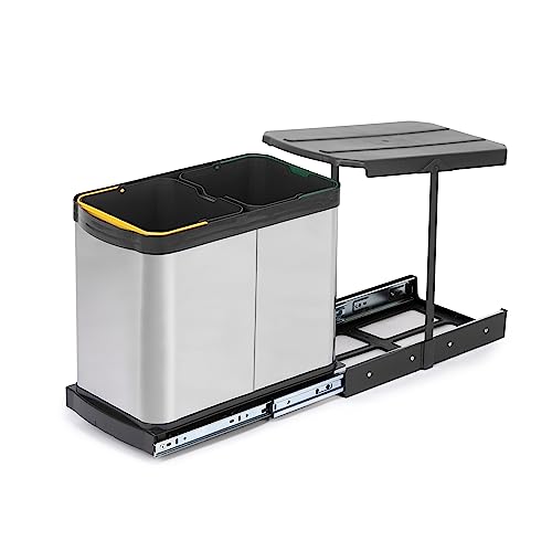 Emuca - Recycle Inox recycling bins for kitchen, 2 x 12 L, bottom fixing and manual/automatic removal.
