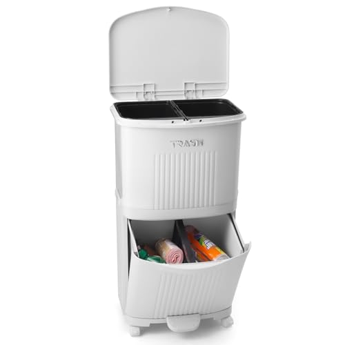 Warmiehomy Recycling Bins for Kitchen Double Bin with Pedal 36L Dry and Wet Separation Rubbish Bin with Inner Bucket 3 Compartment Bin with Wheels