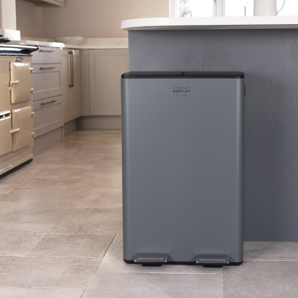 CHARLES BENTLEY Kitchen Bin, 60 Litre, Double Compartment, Grey, Kitchen Bin, Rubbish Bin, Bins for Kitchen Waste, Pedal Bin, Double Bin, Recycling