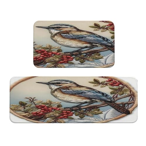 Bird on Branch Kitchen Rugs Set of 2, Cushioned Anti-Fatigue Kitchen Mats for Floor, Waterproof Comfort Standing Mat Absorbent Velvet Kitchen Runner Rugs 17"x30"+17"x47"