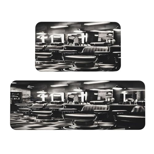 Barber Shop Monochrome Style Kitchen Rugs Set of 2, Cushioned Anti-Fatigue Kitchen Mats for Floor, Waterproof Comfort Standing Mat Absorbent Velvet Kitchen Runner Rugs 17"x30"+17"x47"
