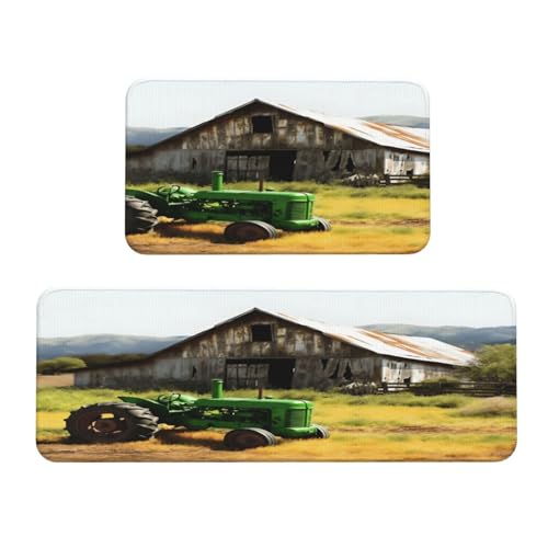 Old Wooden Barn with Tractor Garden Kitchen Rugs Set of 2, Cushioned Anti-Fatigue Kitchen Mats for Floor, Waterproof Comfort Standing Mat Absorbent Velvet Kitchen Runner Rugs 17"x30"+17"x47"