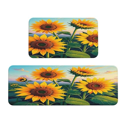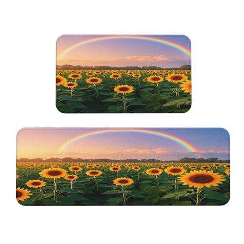 Colorful Sunflowers and Rainbows Kitchen Rugs Set of 2, Cushioned Anti-Fatigue Kitchen Mats for Floor, Waterproof Comfort Standing Mat Absorbent Velvet Kitchen Runner Rugs 17"x30"+17"x47"
