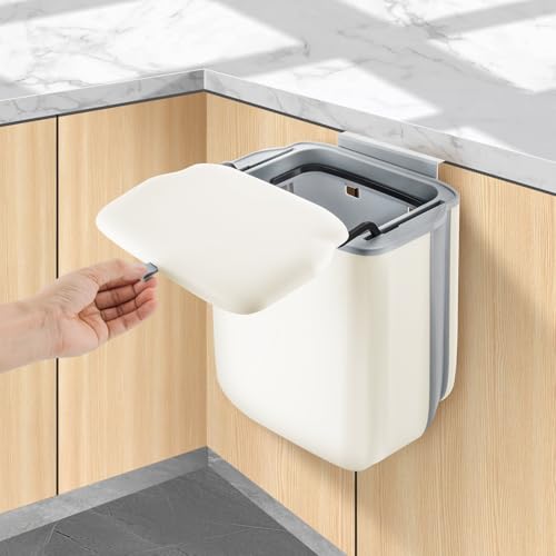 Nymblis Foldable Hanging Trash Bin with Lid, 10L Food Waste Caddy for Kitchen, 2.4 Gallon Small Under Sink Bins for Kitchen/RV/Counter top/Camping (Cream)