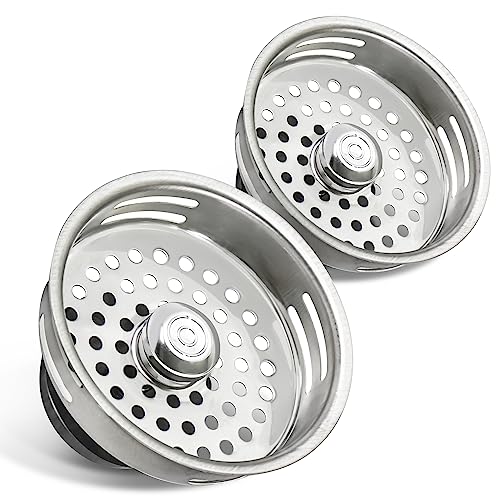 KONE 2PCS Kitchen Sink Strainer Replacement for 3-1/2 Inch Standard Drains Brushed Stainless Steel Basket Metal Center Knob with Rubber Stopper
